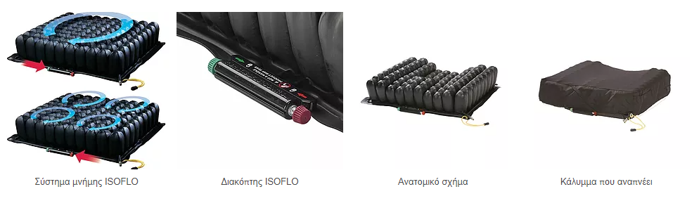 Η επιλογή ή όχι της επικοινωνίας του αέρα στα τέσσερα τεταρτημόρια πραγματοποιείται μέσω του διακόπτη ISOFLO στο εμπρόσθιο μέρος του μαξιλαριού. Όταν ο διακόπτης είναι ρυθμισμένος στο πράσινο, ο αέρας κυκλοφορεί σε όλο το μαξιλάρι. Όταν βρίσκεται στο κόκκινο, ο αέρας περιορίζεται στο κάθε τεταρτημόριο.