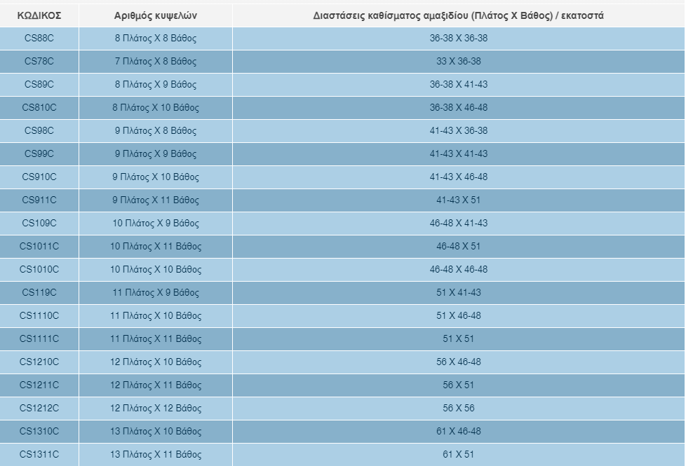 ΣΗΜΕΙΩΣΗ: Για την κωδικοποίηση του Quadtro Select, ακολουθούνται τα εξής βήματα: πρώτα τοποθετείται το πρόθεμα QS, στη συνέχεια ο αριθμός κυψελών στο πλάτος, μετά ο αριθμός κυψελών στο βάθος και τέλος η συντομογραφία LPC (για ύψος 5 εκ.) ή C (για ύψος 10 εκ.). Έτσι, για παράδειγμα, ο κωδικός QS98C υποδηλώνει μαξιλάρι τύπου Quadtro Select, με 9 κυψέλες πλάτος, 8 κυψέλες βάθος και 10 εκατοστά ύψος. Παρακάτω παρατίθενται ορισμένα μεγέθη μαξιλαριών και οι διαστάσεις των καθισμάτων στα οποία ταιριάζουν. Μπορεί να κατασκευαστεί μαξιλάρι διαφορετικών διαστάσεων των παρακάτω, κατόπιν παραγγελίας.