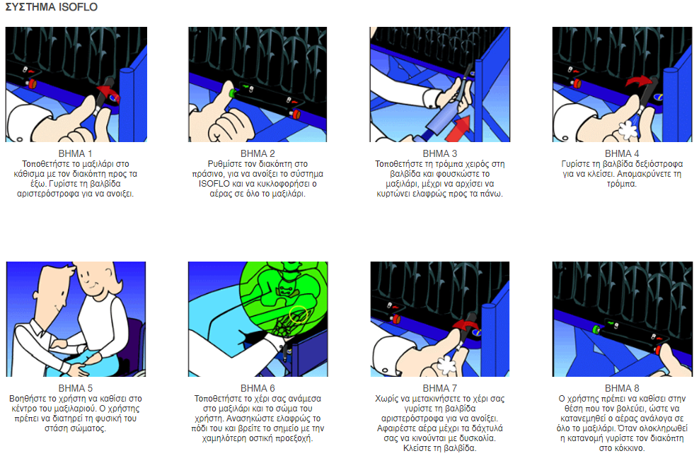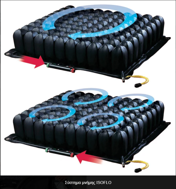Η επιλογή ή όχι της επικοινωνίας του αέρα στα τέσσερα τεταρτημόρια πραγματοποιείται μέσω του διακόπτη ISOFLO στο εμπρόσθιο μέρος του μαξιλαριού. Όταν ο διακόπτης είναι ρυθμισμένος στο πράσινο, ο αέρας κυκλοφορεί σε όλο το μαξιλάρι. Όταν βρίσκεται στο κόκκινο, ο αέρας περιορίζεται στο κάθε τεταρτημόριο.