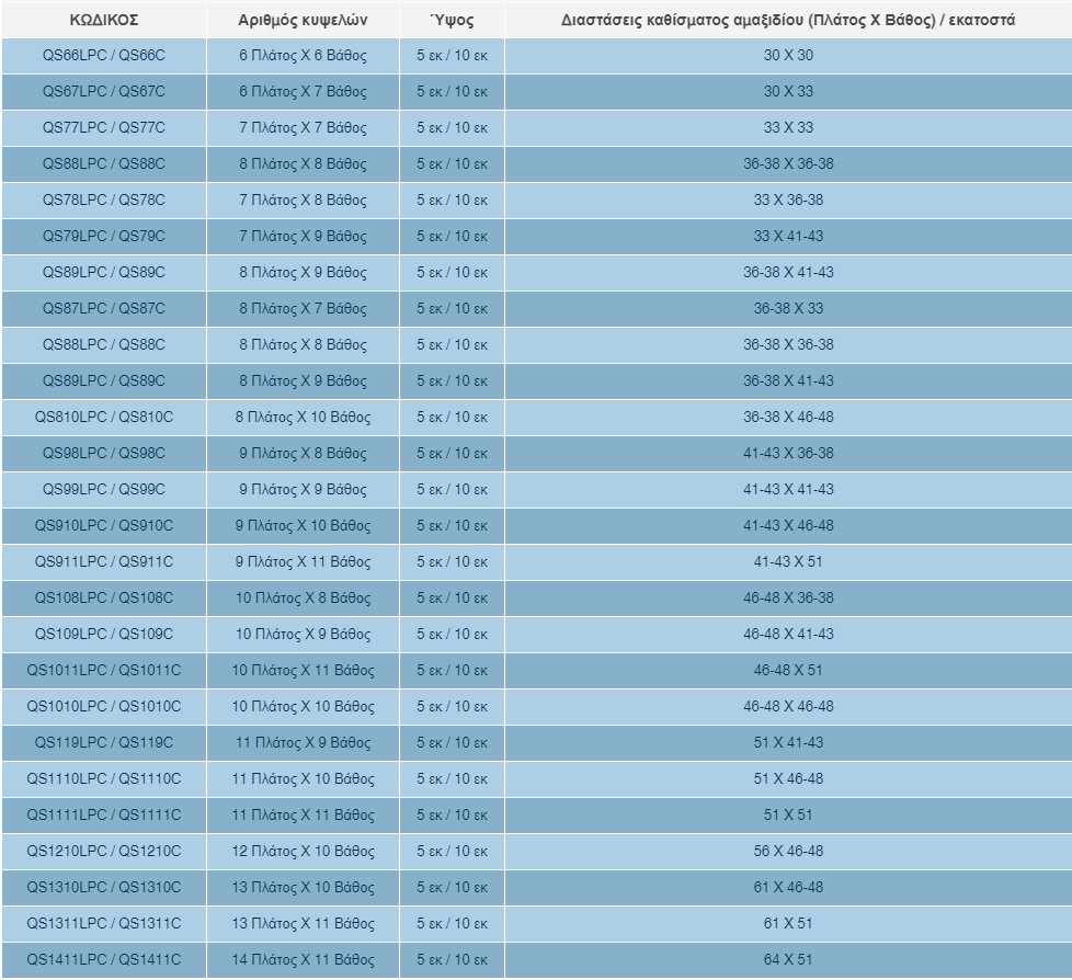 ΣΗΜΕΙΩΣΗ: Για την κωδικοποίηση του Quadtro Select, ακολουθούνται τα εξής βήματα: πρώτα τοποθετείται το πρόθεμα QS, στη συνέχεια ο αριθμός κυψελών στο πλάτος, μετά ο αριθμός κυψελών στο βάθος και τέλος η συντομογραφία LPC (για ύψος 5 εκ.) ή C (για ύψος 10 εκ.). Έτσι, για παράδειγμα, ο κωδικός QS98C υποδηλώνει μαξιλάρι τύπου Quadtro Select, με 9 κυψέλες πλάτος, 8 κυψέλες βάθος και 10 εκατοστά ύψος. Παρακάτω παρατίθενται ορισμένα μεγέθη μαξιλαριών και οι διαστάσεις των καθισμάτων στα οποία ταιριάζουν. Μπορεί να κατασκευαστεί μαξιλάρι διαφορετικών διαστάσεων των παρακάτω, κατόπιν παραγγελίας.